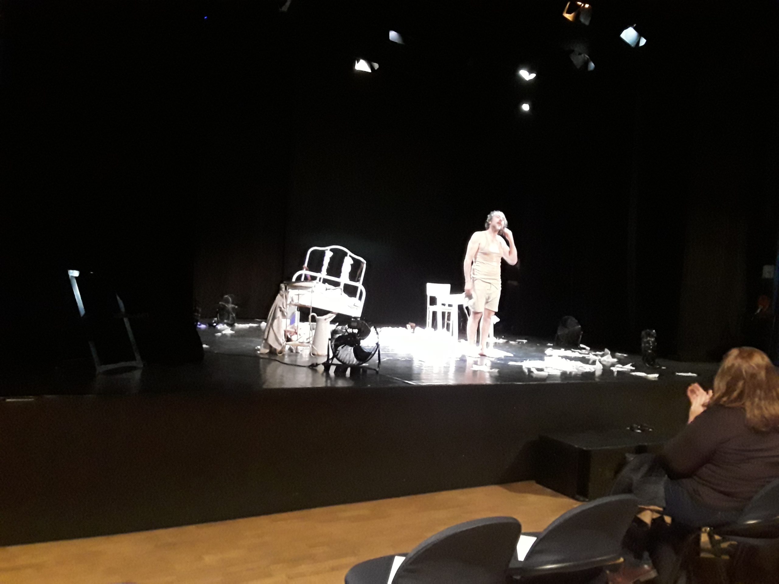 Nel suo adattamento del famoso racconto di Gogol (1835) Diario (o Memorie) di un pazzo, Emanuele Santoro ha scelto di collocare la scena in un manicomio fin dall’inizio e in un’epoca che si suppone contemporanea, vista la presenza di una coppia d’infermieri (Jamie Lee Moser e Michele Martone), quasi delle comparse che, a parte poche azioni e battute (per fortuna verrebbe da dire…), passeranno il tempo seduti agli angoli del palcoscenico, alle prese con i rispettivi cellulari.